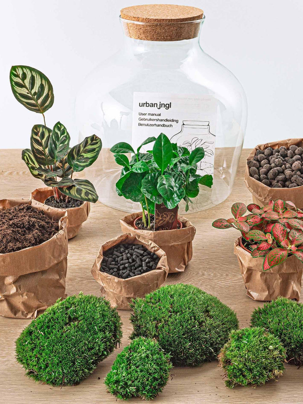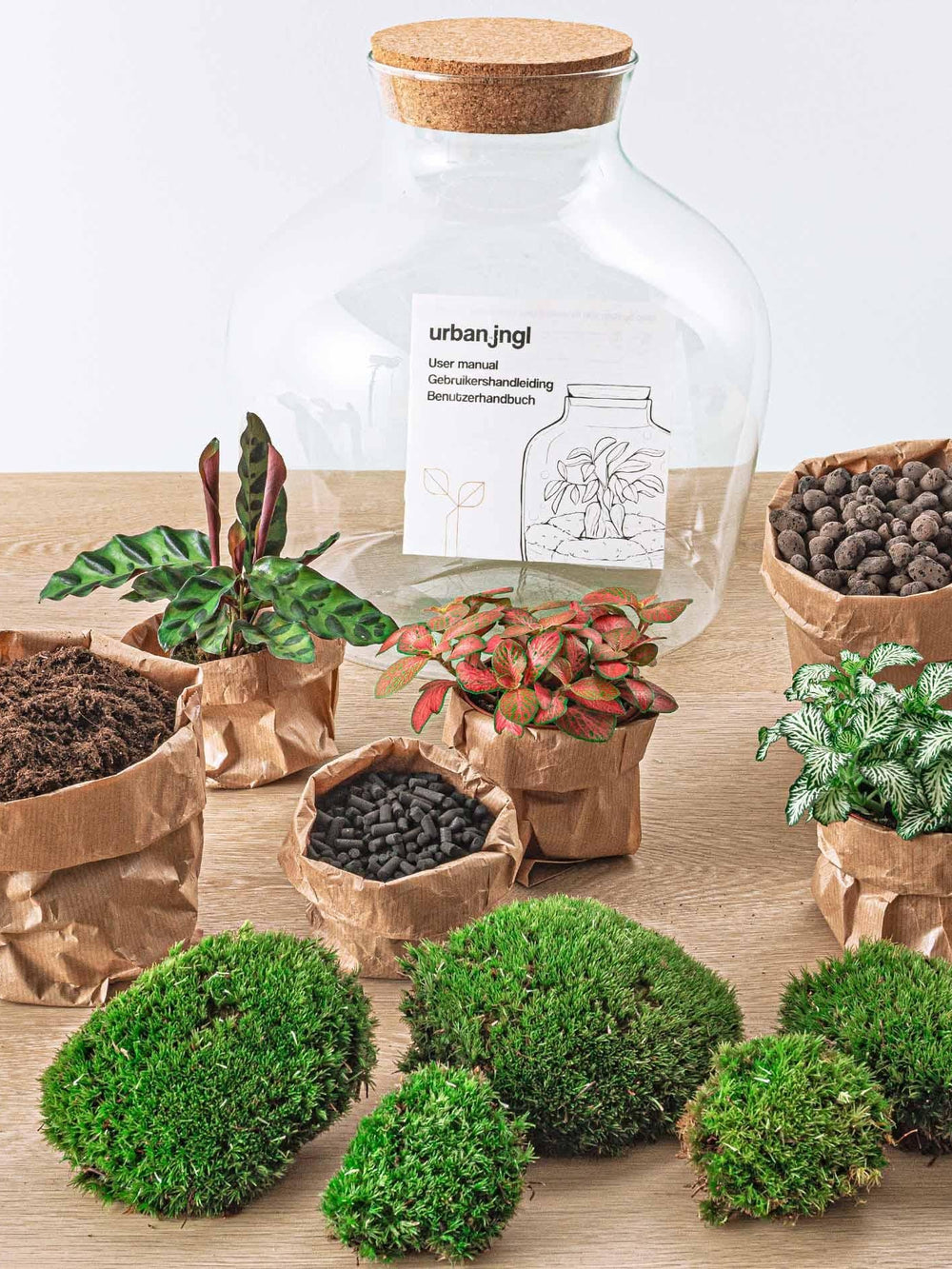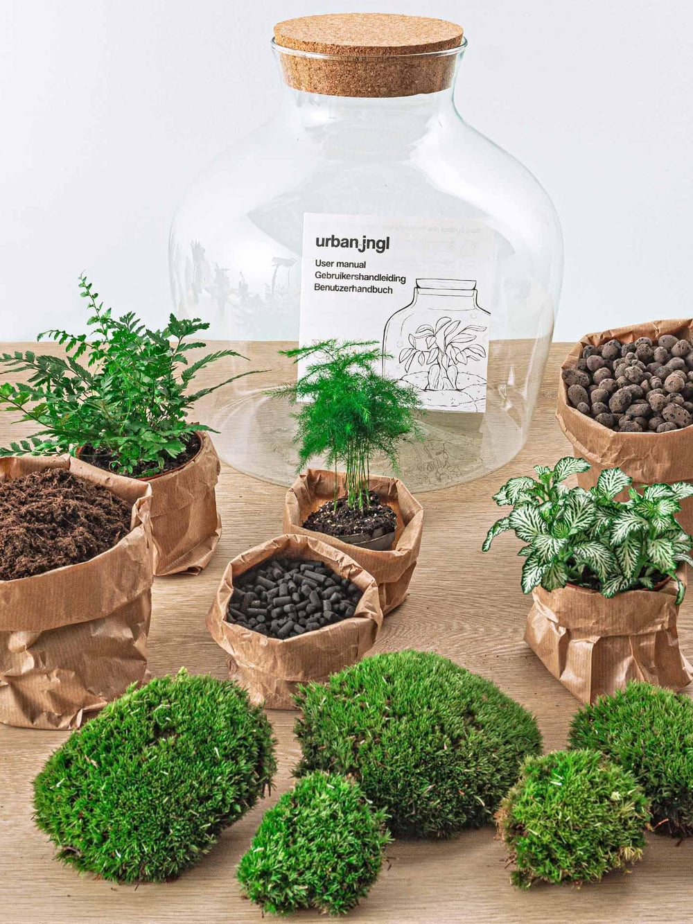 Chaque kit contient tout le nécessaire pour créer facilement un terrarium décoratif et durable : un petit écosystème autosuffisant qui apporte une touche de nature dans votre intérieur.